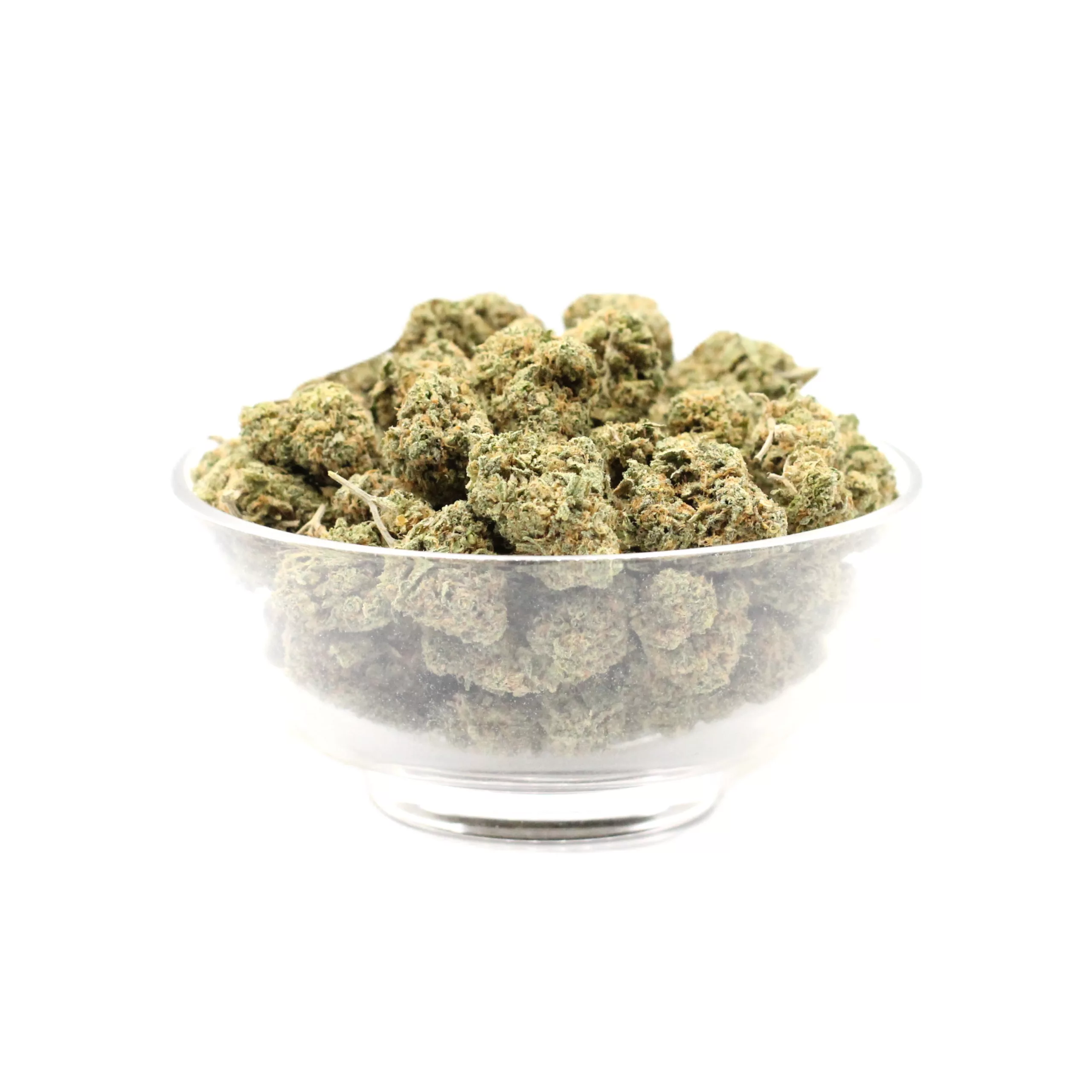 Blue Dream is a slightly sativa dominant hybrid (60% sativa/40% indica) strain that is a potent cross between the hugely popular BlueberryX Haze strains. This infamous bud boasts a moderately high THC level that ranges from 17-24% on average and a myriad of both indica and sativa effects. Users describe the Blue Dream high as having an immediate onset of an uplifting cerebral head high that leaves you completely motivated and focused with waves of creative energy that hit quickly and hard. This is accompanied by a mellow relaxing body high that leaves you warmed, numb, and completely pain free. Due to these potent combination effects, Blue Dream is said to be an ideal strain for treating patients suffering from conditions such as chronic stress, chronic pain due to injury or illness, mild to moderate cases of depression, and sleep disorders, including insomnia. Blue Dream has a delicious aroma of sweet blueberry pie and a taste of sugary sweet blueberries that stays on your tongue long after smoking. This bud has large dense yet fluffy popcorn-shaped bright neon green nugs with amber and blue hairs and rich blue undertones. These nugs are dusted with a fine layer of sandy milky white trichomes and sweet sticky resin.