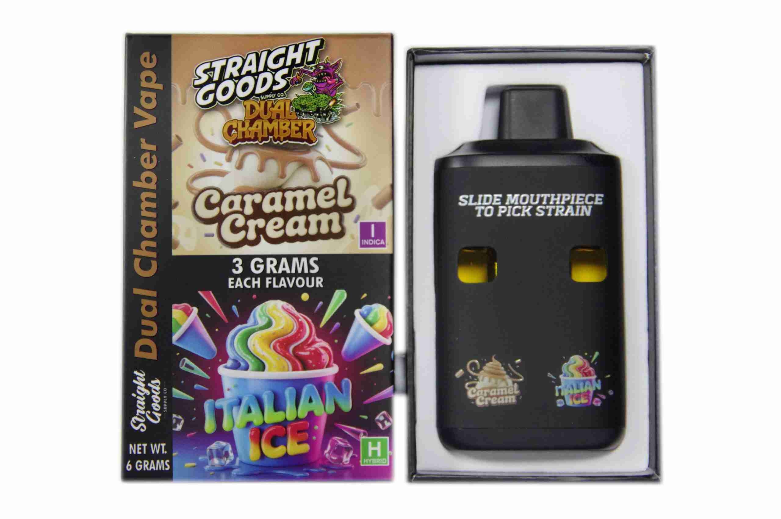 Straight Goods Dual Chamber Vape – Caramel Cream (Indica) + Italian Ice (Hybrid) (3 Grams + 3 Grams)