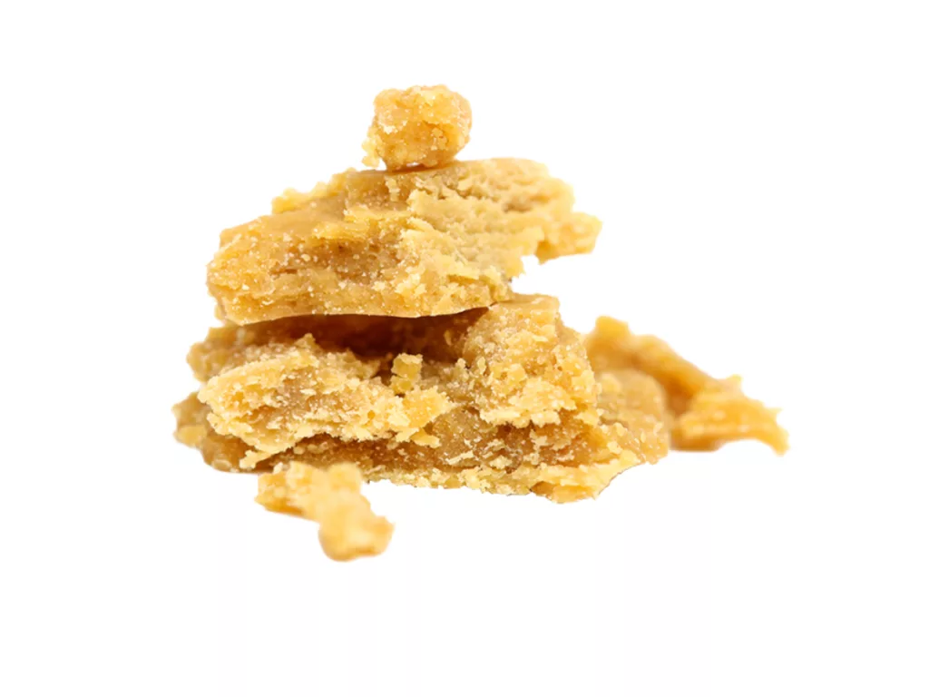A cannabis concentrate with a dry, powdery consistency—it crumbles easily, hence its name. Crumble, sometimes called “honeycomb” because of its appearance, is one of the driest forms of concentrate and is made through an extraction process similar to shatter, using a chemical solvent such as butane, propane, or CO2. Crumble tends to have a yellow color and can have up to 90% THC.
